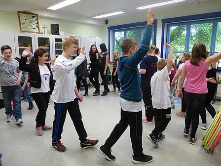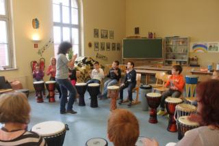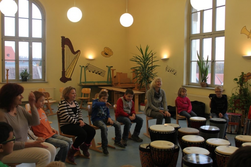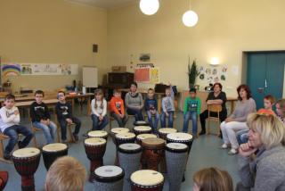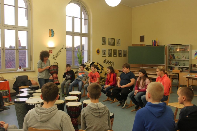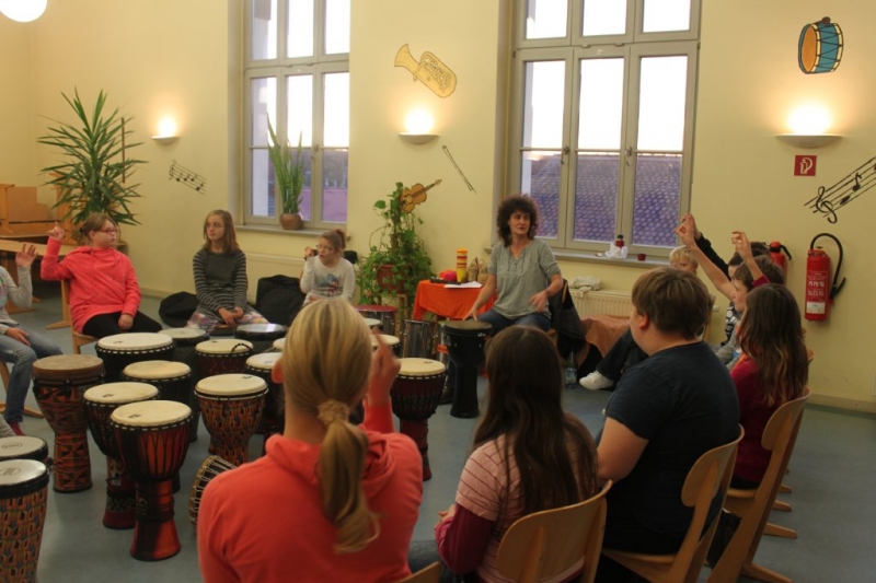 Am 24. November und 4. Dezember 2017 fand für alle Schüler der Schule ein Trommelkurs auf afrikanischen Djemben und peruanischen Trommelkisten (Cajons) statt. Ein Djembe kann als Solo-, aber auch als Ensembleinstrument eingesetzt werden. Man spielt sie sitzend oder stehend. Sie wird mit den bloßen Händen geschlagen, dabei entscheiden nur die Handspannung und auch der Anschlagepunkt über den Klang.