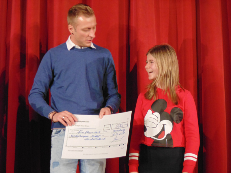 EIN STÜCK VOM GLÜCK übergab unsere Schülerin Lea im Namen der Schule an Herrn Köhler vom Kinder- und Jugendhospiz: ein Check in Höhe von 500€.